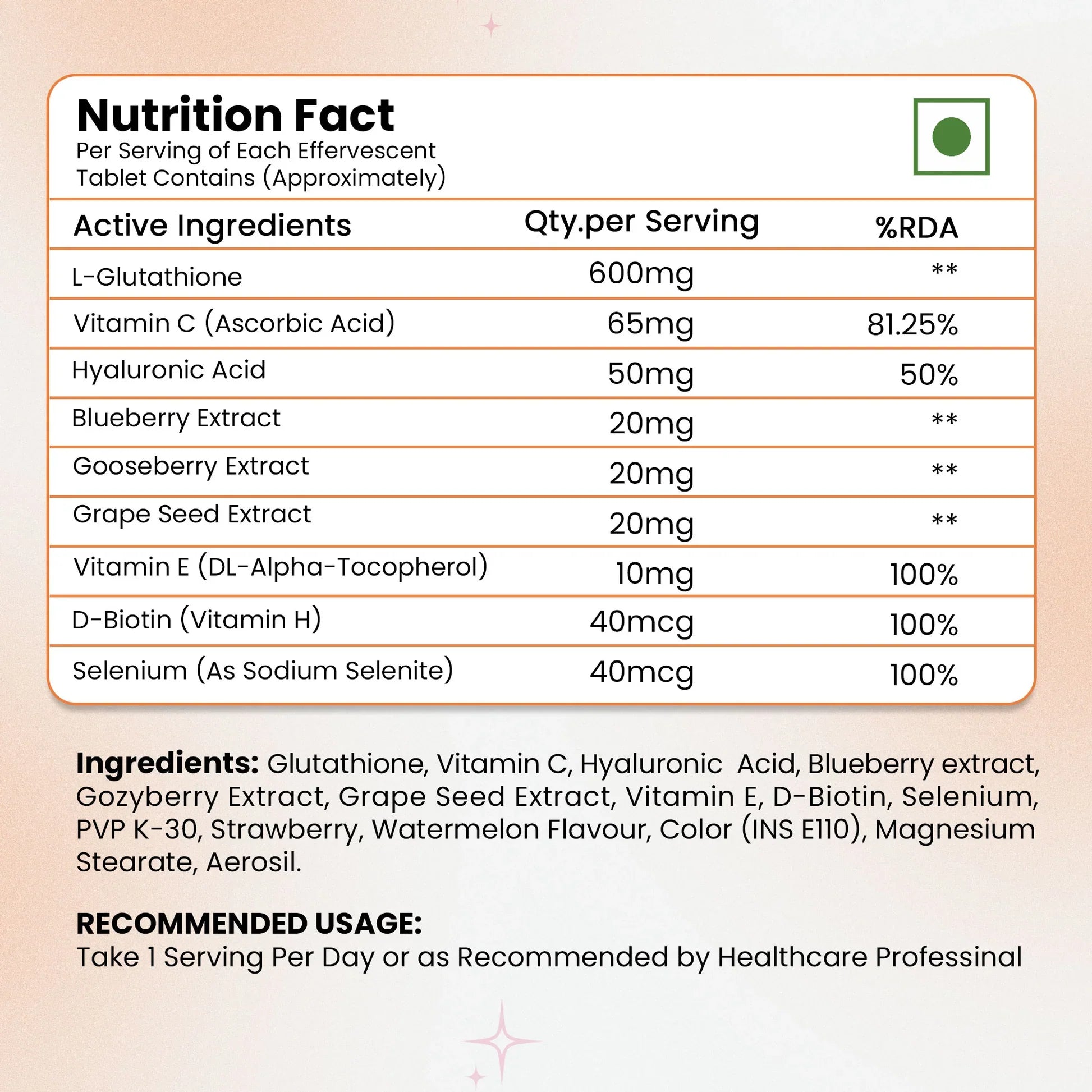 L-Glutathione Effervescent Tablets – 15N Packed with Vitamin C, Hyaluronic Acid & Biotin (Watermelon & Strawberry)