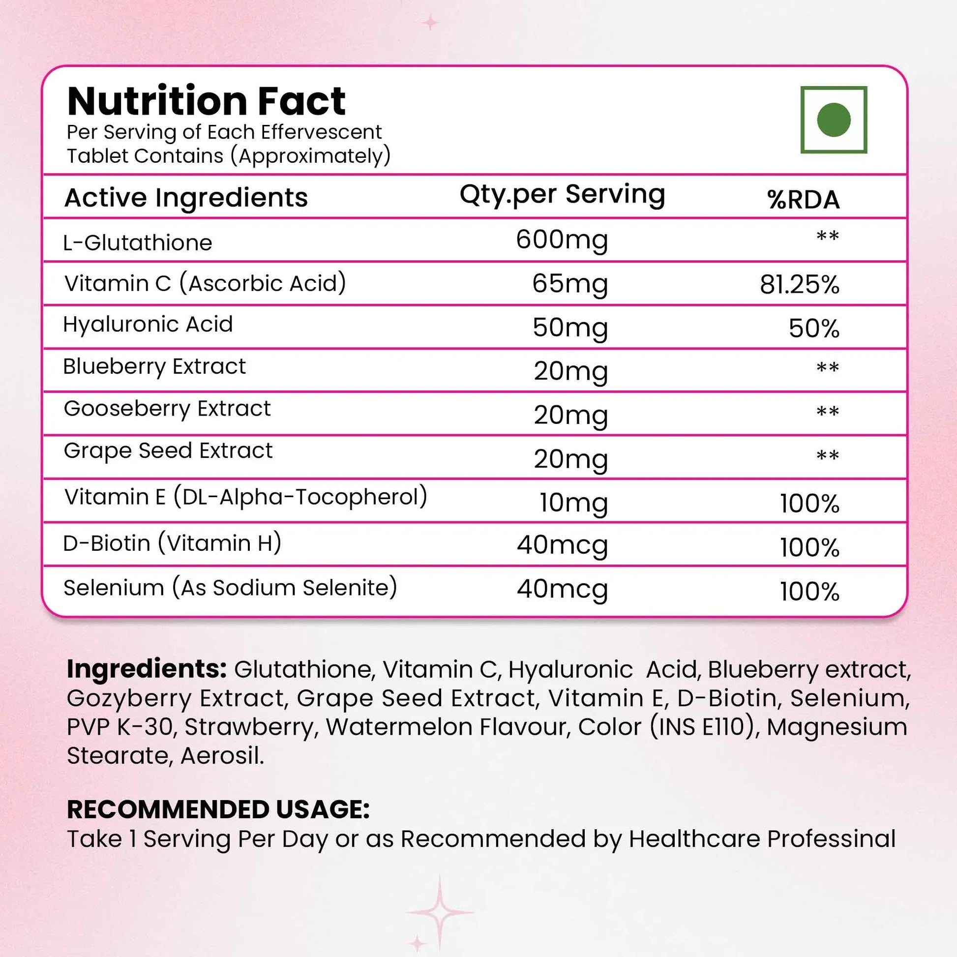Each tablet delivers 600mg of L-Glutathione with Vitamin C, Hyaluronic Acid, and antioxidants to brighten skin, reduce tanning, and support hydration. Available in a refreshing Watermelon flavour, these sugar-free, fast-dissolving tablets work from within for healthy, glowing skin.